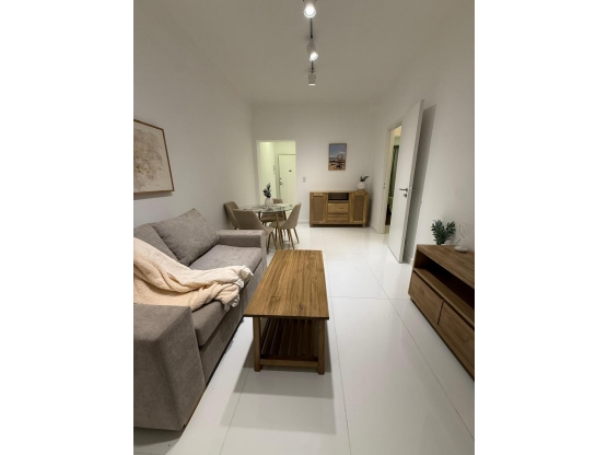 🛋️ Al ingresar mediante hall de distribución, accedemos al amplio y cómodo living comedor con balcón salida a patio. TV de 43”. Sillón, mesa ratona, mueble para TV, mesa con 4 sillas, lámpara de pie, mueble de apoyo, cortinas Hunter Douglas. En el patio muebles de exterior